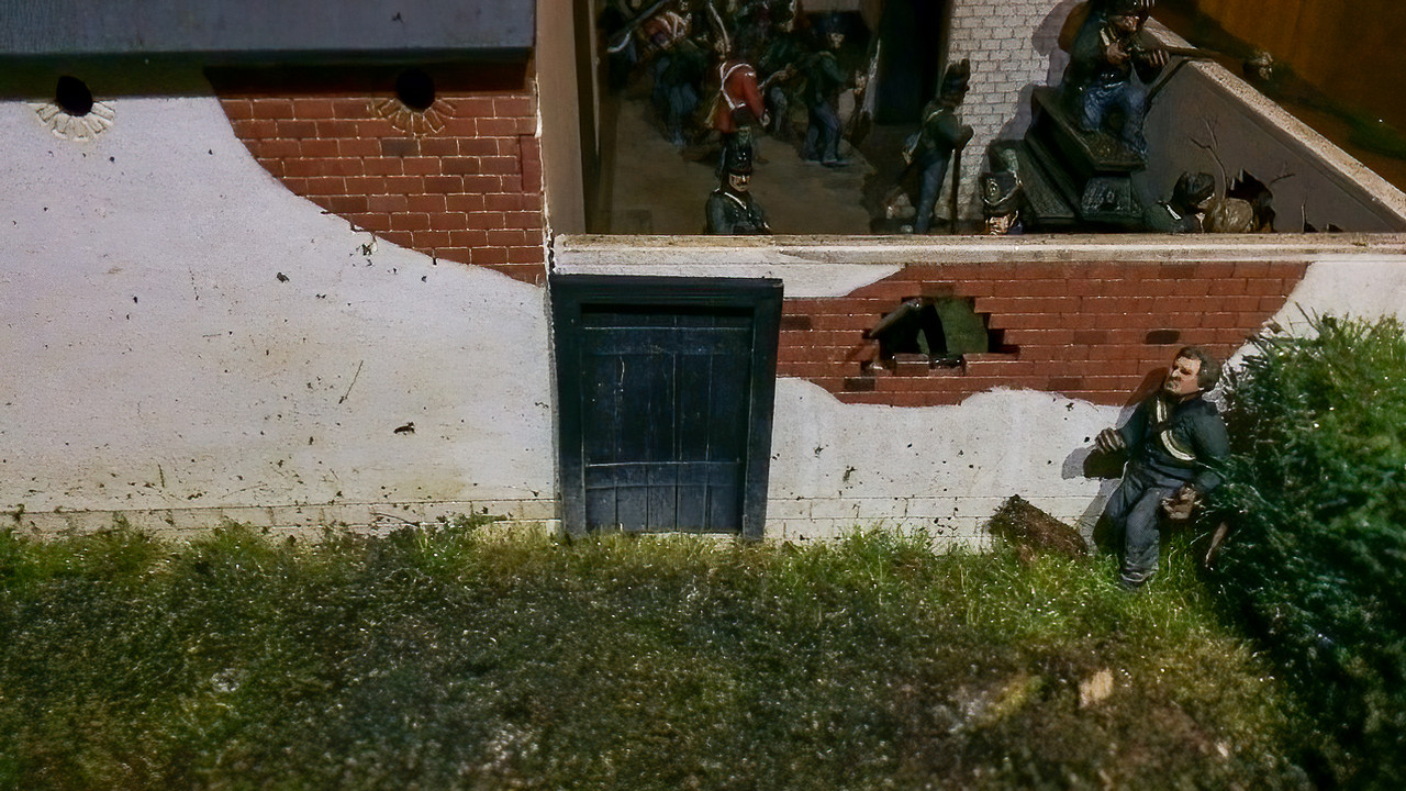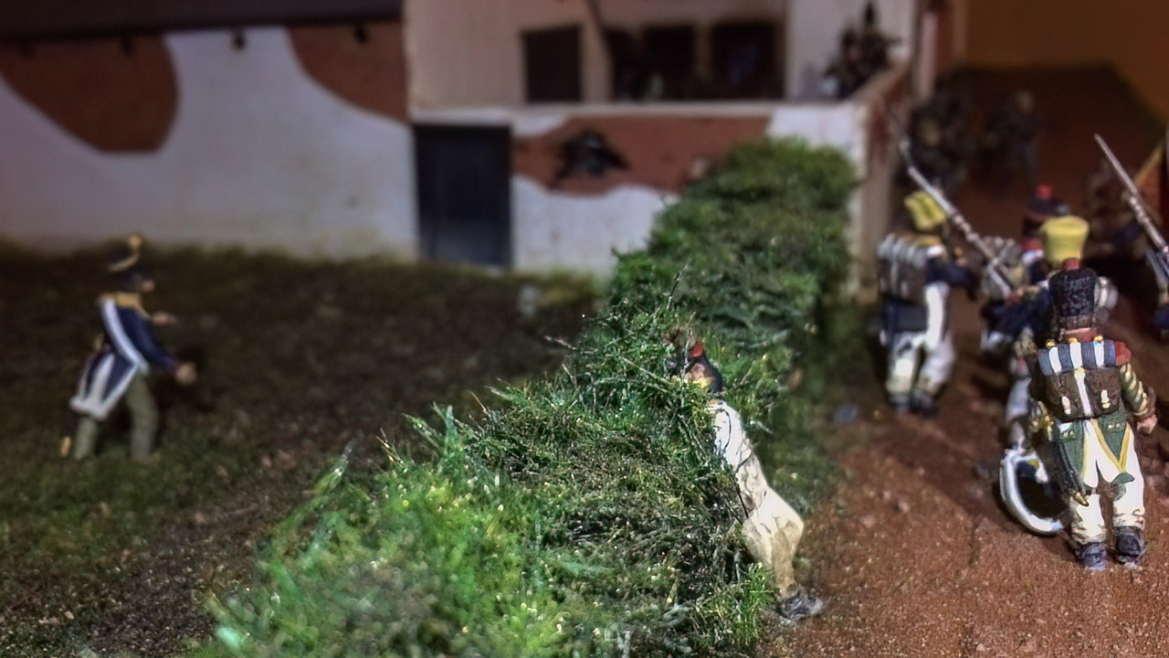 The 54th and 55th Ligne French divisions have been thrown at LHS - the orchard and the kitchen garden, but have been repelled Twice by accurate and deadly fire from the 1st and 2nd KGL with their Baker Rifles, they retreated inside the farm complex but made defensive positions inside the walls and on the roofs.